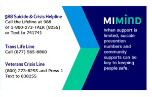 Visit the Tools and Materials page to access these materials and print them in your office. Crisis Cards are business-card size, making the MI Mind printed cards handy to give to patients and their loved ones.
