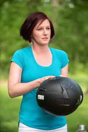 Stewart remembers few details about the accident after the couple riding separately approached an intersection on a yellow light. A miscommunication between the couple resulted in Stewart colliding with her husband’s motorcycle. “I remember skidding and I remember the impact. I don’t remember flying through the air,” she says.