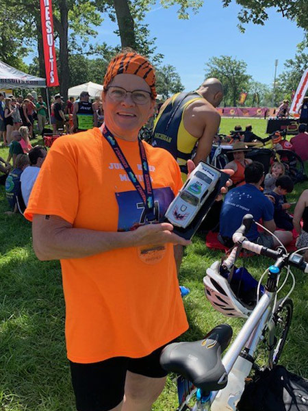 “It started when I turned 50,” Catherine says. “I had lost 100 pounds, and my son encouraged me to do something different. He got me into racing, and I lost another 20 pounds training for my first one. After that, I did the Motor City sprint triathlon every year, and everyone was used to seeing me ride my bike around. After my treatment, I’m reintroducing all of that back into my life and it’s wonderful.”