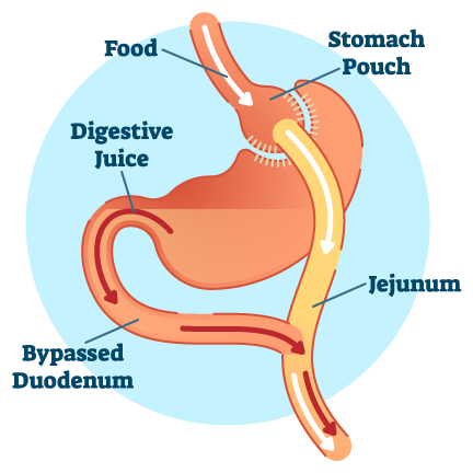 During this procedure, a small stomach pouch is created to decrease the amount of food it can hold. Reconfiguration of the small intestine allows food to bypass a portion of the small intestine to limit the calories your body absorbs.