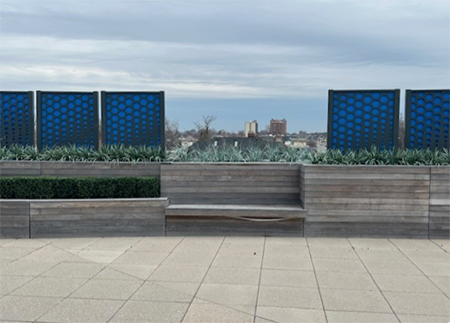 In addition to the greenwalls, the terrace has been enlivened with highly realistic faux plants and grasses native to the region with seasonal additions — including boxwoods, evergreen and cypress trees, maple bushes, ferns, eucalyptus and lavender. The layered landscaping and artistic additions warm up the space, emulating the feeling of a private garden.