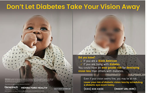 Genentech provided existing educational materials such as posters, flyers and table tents. These were tested against alternate materials to see what resonated. For example, the blurred poster (at right) was much more impactful than the crisp, clear one by dramatically showing what it’s like to lose your vision.