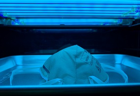 The facemasks were kept dry in a biosafety cabinet at room temperature for 40 minutes. Then they were moved to the phototherapy unit for decontamination using a dose of 1.5 J/cm2 ultraviolet light radiation – at a wavelength of 254 nanometers – to each side of the mask for about 60 seconds. Ultraviolet radiation is measured in three wavelengths: UV-C, UV-B and UV-A. UV-B and UV-A are associated with skin cancer and are also used in the treatment of some dermatologic diseases such as vitiligo and psoriasis.