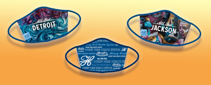 The masks come in Henry Ford Health- and HAP-branded versions and “All For Detroit” and “All For Jackson” versions that feature public murals from Detroit and Jackson. The mural artists generously allowed their work to be used for this campaign.