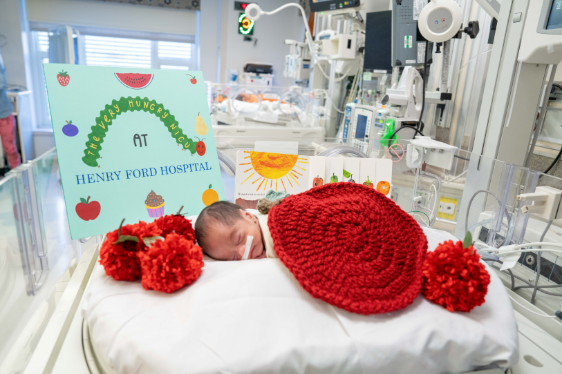 Henry Ford team members encourage families and visitors to read to the babies during their stay in the NICU, so the costumes were inspired by the classic children’s book “The Very Hungry Caterpillar” by Eric Carle. Nurses dressed the hospital’s tiniest patients as an apple, a strawberry, a pear, a slice of cherry pie and more—all inspired by the caterpillar’s famous feast.